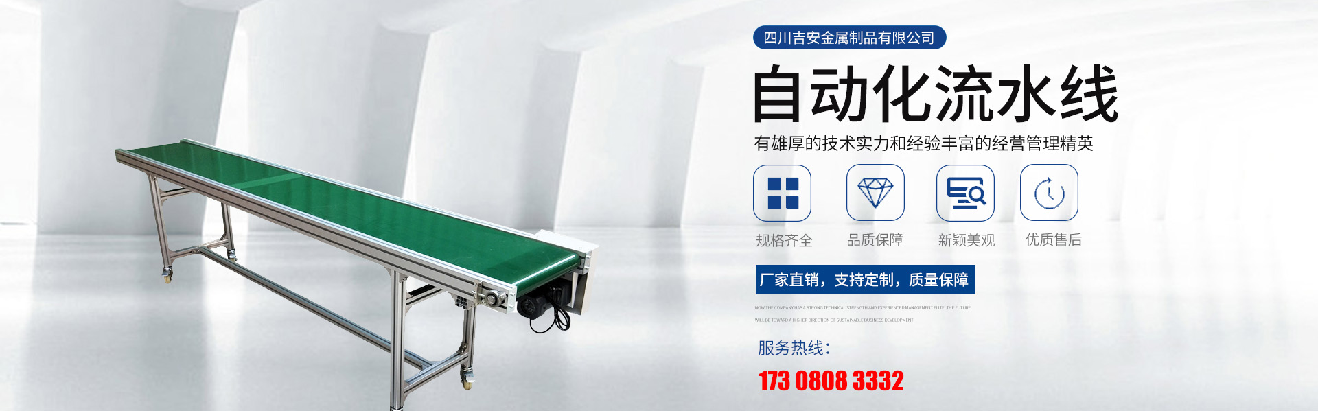 四川吉安金屬制品有限公司是集工業(yè)鋁型材及配件、貨架、工作臺、皮帶輸送線、自動化流水線、線棒精益管及扣件、鈑金和鋁合金流利條、鋁線棒及扣件、倉儲設備、物流器具、周轉(zhuǎn)臺車、工位器具、非標器具設...